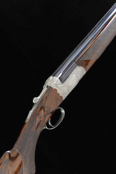 28-inch monobloc barrels with 2 3/4-inch chambers, about 1/4 and 1/2 choke borings, machined ventilated rib and crossbolt extension, the scroll-back frame and top lever with game scene engraving surrounded by foliate scrollwork, signed by the engraver "A. Big", detachable trigger block, 14 1/4-inch well figured stock with Prince of Wales grip, 7lb. 6oz., Italian nitro proof, vinyl covered case