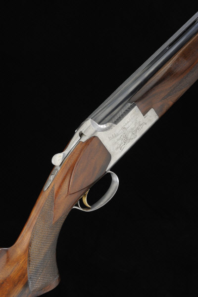 27 1/2-inch barrels with 2 3/4-inch chambers, about 1/4 and 3/8 choke borings, machined ventilated rib, the frame and top lever with game scene engraving, selective single trigger, 14-inch figured stock with pistol grip and rubber recoil pad, 7lb. 5oz., Belgian nitro proof