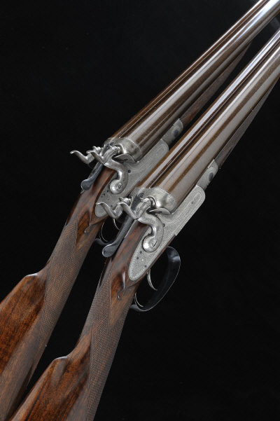 JOSEPH HARKOM A SCARCE MATCHED PAIR OF 12-BORE TOP LEVER HAMMER GUNS, NOS. 1563/1983 30-inch damascus barrels with 2 3/4-inch chambers, about improved cylinder borings, the frames, rebounding bar locks, hammers and top levers with fine scroll engraving, 14-inch highly figured stocks with ribbed butt plates, the combs each with a small let-in horn pad, 7lb. 3oz., nitro re-proof, in their brassbound oak and leather case S2 |