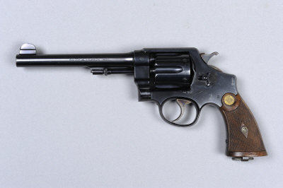 SMITH & WESSON A SCARCE .455 HAND EJECTOR MARK II SERVICE REVOLVER, NO. 43273 6 1/2-inch barrel impressed with patent dates to 1906, solid frame with swing-out cylinder, impressed with Enfield inspector's marks and broad arrow release marks, chequered walnut grips, lanyard ring, retaining virtually all of its original finish, nitro proof