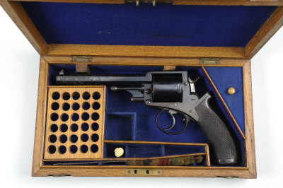 6-inch octagonal barrel, the top surface engraved 'Adams Patent Small Arms Co., 391 Strand, London', solid frame with loading gate, ejector rod, one-piece chequered walnut grip, retaining some original finish overall, black powder proof, in its fitted oak case