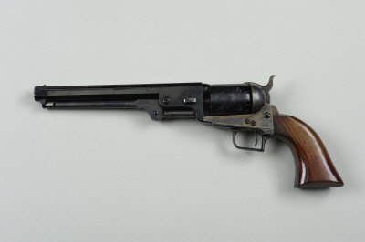 7 1/2-inch octagonal barrel, the top surface impressed with New York address, the numbered cylinder with rolled naval scene, the plain frame, hammer and loading lever retaining much of their original hardening colour, square back trigger guard, smooth walnut grip, black powder proof, in a made up case