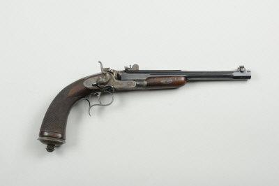 10-inch octagonal fluted barrel with adjustable fore and rear sights, the top panel inlaid in gold, the frame, rebounding bar lock, hammer and side lever with fine scroll engraving and retaining much original hardening colour, chequered walnut grip with steel furniture, Belgian black powder proof