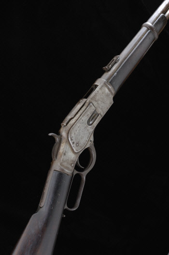 WINCHESTER A .44 WCF MODEL 1873 LEVER ACTION SADDLE RING CARBINE, NO. 457007B 20-inch barrel with full-length magazine tube, folding rear sight, plain receiver with sliding dust cover and saddle ring, 12 3/4-inch stock with steel butt plate, 7lb. 4oz., nitro proof ‡ VAT @ 5% is payable on the hammer price. |