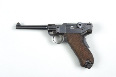 4 1/2-inch barrel, the chamber with impressed American eagle, the toggle impressed 'DWM', the frame with grip safety, chequered grips, replacement magazine, retaining much original finish overall, nitro proof (minimal marks), in a leather holster