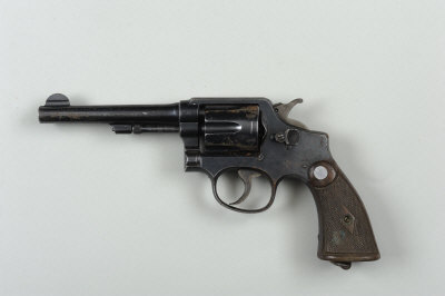 SMITH & WESSON A .38 S&W MILITARY AND POLICE MODEL SERVICE REVOLVER, NO. 762185 5-inch barrel, the frame with British military inspection marks, chequered walnut grip, lanyard loop, nitro proof, in its leather holster S5 |