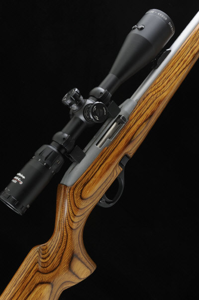 20-inch barrel fitted with a sound moderator, the receiver mounted with a Nikko Stirling Laser King telescopic sight, battery cover missing, the half length laminated stock with pistol grip and maker's butt plate, 14-inch pull, 7lb. 15oz., nitro proof