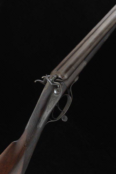 30-inch damascus barrels with 2 1/2-inch chambers, about true cylinder borings, the rounded frame, non-rebounding backlocks, hammers and rotary underlever with scroll engraving, 14 1/2-inch figured stock with steel butt plate, 7lb. 8oz., black powder proof (1868 Rules), bores marked and dented