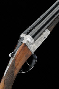 25-inch barrels with 2 1/2-inch chambers about 1/4 choke borings, mid extension, the frame with fine bouquet and scroll engraving, the maker's name signed within a scrolling banner, 16-inch figured stock including 1 1/2-inch extension and cast off for central vision, 6lb. 3oz., nitro proof