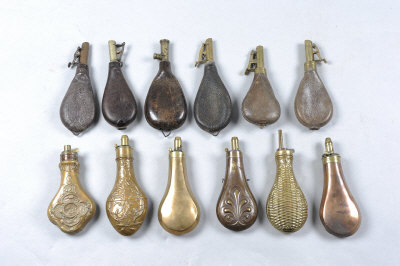 A GROUP OF SHOT AND POWDER FLASKS