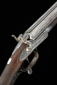 28 1/2-inch barrels with 2 1/2-inch chambers, the frame, non-rebounding bar locks, hammers and rotary underlever with scroll engraving, grip safety, 14 1/2-inch figured stock with steel butt plate, 7lb., black powder proof (1868 Rules), bores pitted, rib lifting
