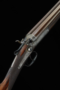 28-inch damascus barrels with 2 3/4-inch chambers about improved cylinder and 1/2 choke borings, the rounded frame, hammers, rebounding backlocks and top lever with border and scroll engraving, 14 1/2-inch figured stock, 5lb. 5oz., recent nitro re-proof
