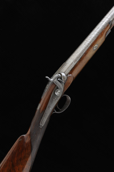 BURNETT A 15-BORE SINGLE BARREL PERCUSSION GUN 31 1/2-inch damascus twist barrel, engraved breech, non-rebounding back lock and hammer with scroll engraving around a game scene, half length stock with steel butt plate, 14-inch pull, 7lb. 2oz., black powder proof, in a Reilly fitted mahogany case S58 |