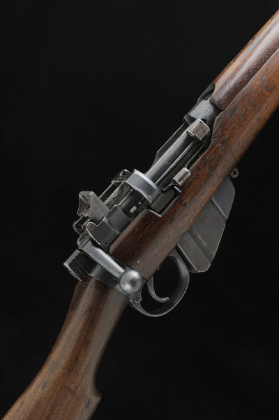 ENFIELD A SCARCE .303 NO.1 MK V BOLT-ACTION SERVICE RIFLE, NO. 6204 25 1/4-inch barrel with ramp fore sight, the receiver with charger bridge and folding aperture rear sight, bolt with side safety, detachable box magazine and magazine cut-off, full length stock with hand guards and brass furniture, 13-inch pull, sling swivels, 8lb. 13oz., nitro proof S1 |
