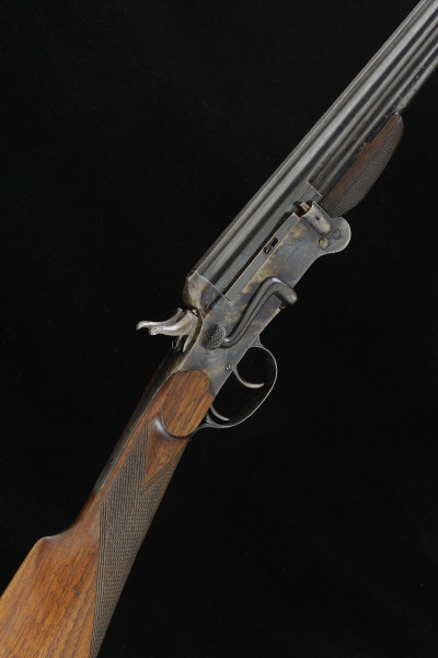 A BELGIAN .410 FOLDING OVER AND UNDER HAMMER GUN, NO. 22141 28-inch barrels with 2 1/2-inch chambers, about true cylinder and full choke borings, the frame with central hammers and side lever, retaining virtually all of its original hardening colour, 13 3/4-inch figured stock with ribbed butt plate, 5lb. 1oz., Belgian nitro proof; together with a similar example, no. 24533b (2) S2 |