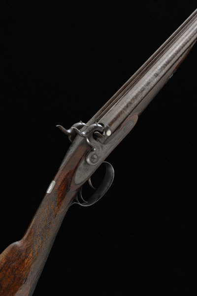 JAMES BURROW A 16-BORE PERCUSSION SPORTING GUN 28 1/2-inch damascus twist barrels with engraved platinum lined breeches and plugs, the tang, non-rebounding bar locks and hammers with border and scroll engraving around scenes of dogs and game, half length well figured stock with engraved steel butt plate, 14 1/4-inch pull, 6lb. 3oz., black powder proof S58 |