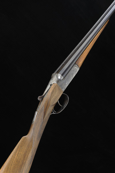 27-inch barrels with 2 1/2-inch chambers, about true cylinder and full choke borings, the frame and top lever with scroll engraving, the maker's name signed within a scrolling banner, 14 1/2-inch figured replacement stock, 4lb. 5oz., nitro proof, bores marked