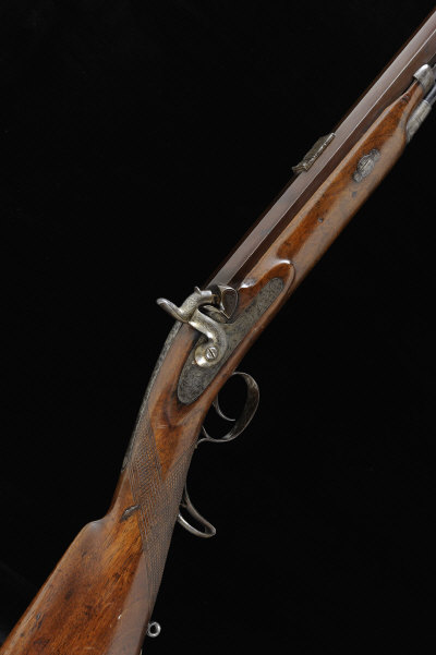 SWINBURN AN 11-BORE PERCUSSION SPORTING RIFLE, NO. 12 32-inch damascus twist octagonal barrel with folding leaf sights, numbered 6523, the tang, non-rebounding bar lock and hammer with scroll engraving, lock plate dated 1863, the half length stock with steel butt plate and patchbox, 14 1/2-inch pull, 9lb. 12oz., black powder proof S58 |