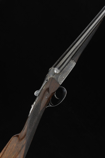 28-inch barrels with 2 1/2-inch chambers, about 1/2 and full choke borings, the frame and top lever with scroll engraving and retaining much original hardening colour, the maker's name signed within a scrolling banner, 14 1/4-inch well figured stock, 4lb. 6oz., nitro proof, bores marked, canvas case