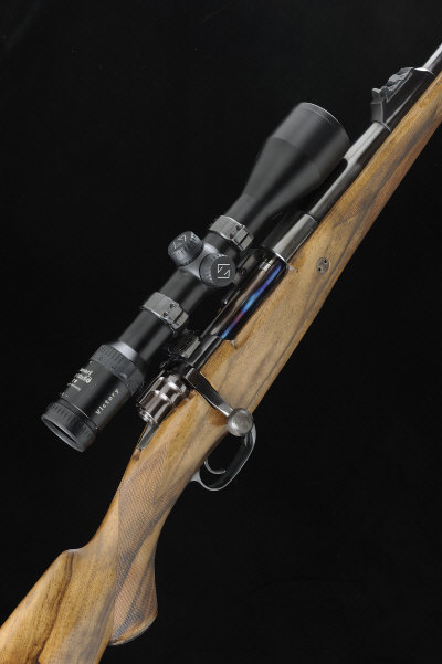 24-inch barrel with ramp fore sight, raised rear sight with folding leaves, ramp fore sight with folding moon bead, the Mauser receiver mounted with a Zeiss Diavari 2.5-10x50 telescopic sight in Holland & Holland style quick detachable mounts, bolt with side safety, recoil stud, magazine with hinged base plate, with fine scroll engraving and inlaid in gold with calibre details, half length well figured stock with pistol grip, cheekpiece and recoil pad, 14 1/2-inch pull, 10lb. 14oz., nitro proof