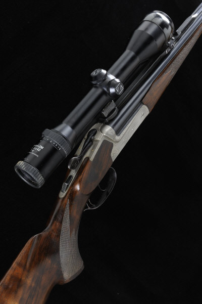 23 1/2-inch barrels with short raised rib, mounted with a Zeiss Diavari-ZM 1.5-6x42 telescopic sight in quick detachable claw mounts, the bolstered frame with border and scroll engraving, cocking indicators, 14 1/2-inch figured stock with pistol grip, cheekpiece and rubber recoil pad, 8lb. 12oz., German nitro proof
