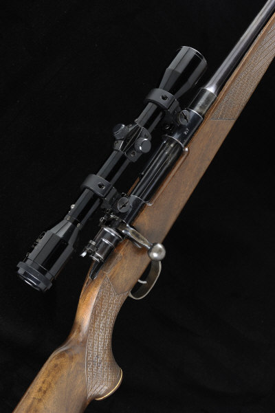 26-inch barrel, the receiver mounted with a Mayo scope variable power telescopic sight, bolt with side safety, half length stock with pistol grip, cheekpiece and recoil pad, 8lb. 12oz., nitro proof
