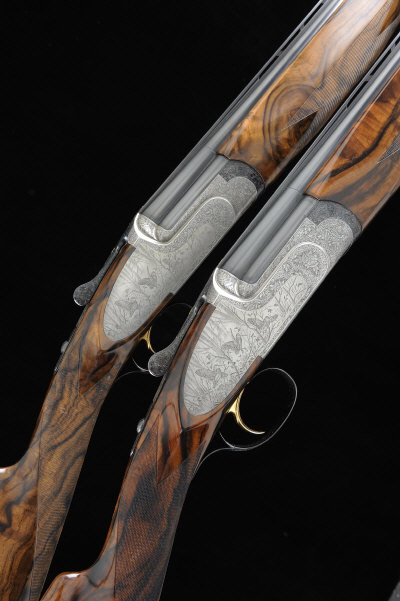 PERAZZI A PAIR OF 20-BORE GALEAZZI-ENGRAVED SCO MODEL SINGLE TRIGGER OVER AND UNDER GUNS, NOS. 80491/2 26-inch monobloc barrels with 2 3/4-inch chambers, with interchangeable choke tubes, machined ventilated ribs, the frames, lock plates and gold numbered top levers profusely engraved with fine scrollwork and bouquets surrounding highly detailed scenes of game in landscapes, the locks with woodcock and snipe, the action bases with a retrieving dog, selective single triggers, 14 3/4-inch highly figured stocks with slim recoil pads, 6lb. 10oz., Italian nitro proof, in their maker's case with spare chokes tubes, etc S2 The guns appear little used. The proof stamp dates the guns to 1991. |