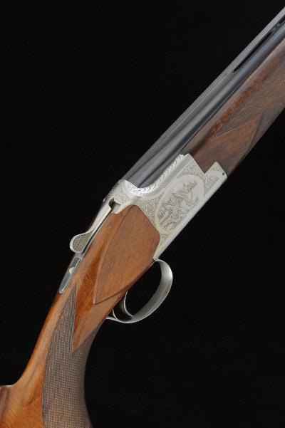 F. N. BROWNING A 12-BORE B2G MODEL SINGLE TRIGGER OVER AND UNDER EJECTOR GUN, NO. 8H3PR07307 27 1/2-inch barrels with 2 3/4-inch chambers, about 1/4 and 1/2 choke borings, machined ventilated rib, the frame and top lever engraved with game scenes surrounded by scrollwork and signed by the engraver "J. Lewanczyk", selective single trigger, 14-inch well figured stock with pistol grip and maker's butt plate, 7lb. 2oz., Belgian nitro proof S2 |