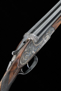 VICTOR SARASQUETA A 16-BORE SIDELOCK EJECTOR GUN, NO. 155456 29-inch chopper-lump barrels with 2 3/4-inch chambers about improved cylinder and 1/2 choke borings, mid extension, the frame and locks with bouquet and scroll engraving and retaining much original hardening colour, clipped fences carved with acorns and oak leaves, 14 3/4-inch well figured stock including rubber recoil pad, cracked and repaired at the head, 7lb., Spanish nitro proof |