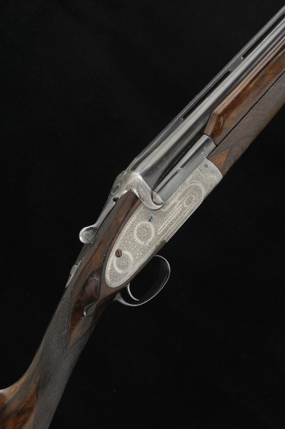 EDWINSON GREEN & SONS A SCARCE 12-BORE SINGLE TRIGGER SIDELOCK EJECTOR OVER AND UNDER GUN, NO. 7092, A TWO BARREL SET 29-inch Whitworth steel chopper-lump barrels with 2 1/2-inch chambers, about 1/4 choke borings, with machined ventilated rib and top extensions, the later interchangeable 29-inch barrels with 2 1/2-inch chambers, about recessed borings, top extension and solid file-cut rib, the frame, locks and top lever with fine bouquet and scroll engraving, single trigger, 14 1/2-inch well figured stock with perished rubber recoil pad, 7lb. 7oz., nitro proof, ejectors require regulation, in its lightweight leather motor case with additional fore-end, extensions, etc S2 The gun incorporates Green patent 14951 of 1912 and is another of the key patents for an over and under gun at this period. When Purdey first considered building an over and under gun it was the Green patent, renowned for its strength, which was chosen. |