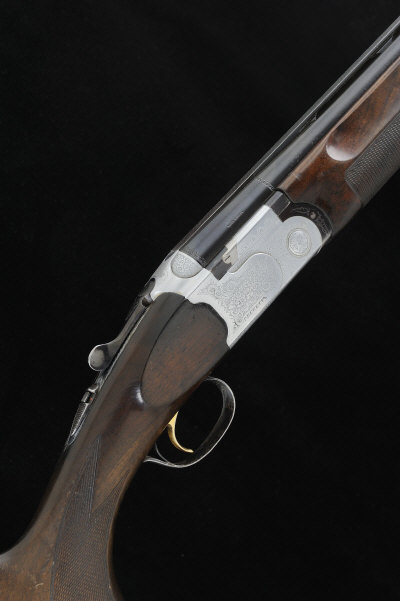 P. BERETTA A 12-BORE MODEL 686 SPORTING SINGLE TRIGGER OVER AND UNDER GUN, NO. F05731B 28-inch monobloc barrels with 2 3/4-inch chambers, about 1/4 and 1/2 choke borings, machined ventilated rib, the frame and top lever with bouquet and scroll engraving, non-automatic safety catch, selective single trigger, 14 1/2-inch figured stock with pistol grip and rubber recoil pad, 7lb. 8oz., Italian nitro proof S2 |