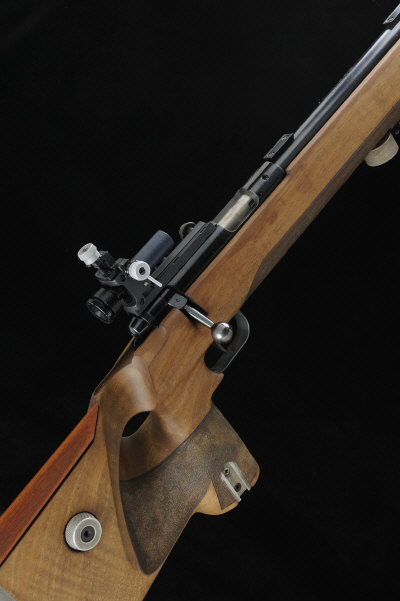 27-inch heavy barrel with tunnel fore sight, the receiver mounted with an aperture rear sight, the three quarter length figured thumbhole stock with pistol grip, adjustable cheekpiece and butt plate, 14-inch pull, 13lb. 6oz., nitro proof