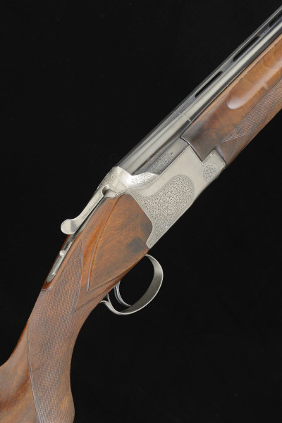 28-inch monobloc barrels with 2 3/4-inch chambers, about 1/4 and 3/4 choke borings, machined ventilated rib, the frame and top lever with scroll decoration, selective single trigger, 14 1/2-inch figured stock with pistol grip and 1/2-inch ebonite extension, 7lb. 1oz., nitro proof