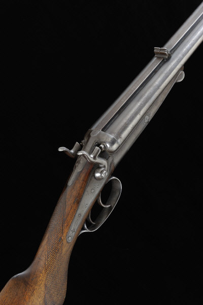 28 1/2-inch barrels, the 16-bore smoothbore barrel with 2 1/2-inch chamber about 3/4 choke boring, the 20-bore barrel rifled, solid rib with folding leaf sight, the frame, rebounding back locks and hammers with border engraving, Lefaucheux action, 14-inch stock with pistol grip, cheekpiece and steel butt plate, 7lb. 6oz., nitro and black powder re-proof