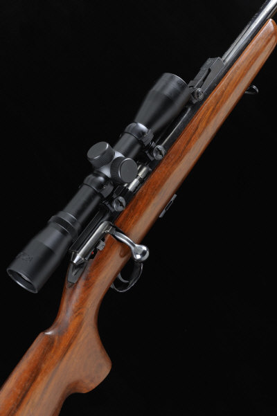 BSA A .22 "SUPERSPORT FIVE" MODEL BOLT-ACTION SPORTING RIFLE, NO. 7778SV 22 1/2-inch barrel with ramp fore sight and adjustable rear sight, the receiver mounted with a BSA telescopic sight, bolt with side safety and detachable box magazine, the half length stock with pistol grip, cheekpiece and maker's butt plate, 13 3/4-inch pull, sling swivels, 7lb. 1oz.. nitro proof S1 |