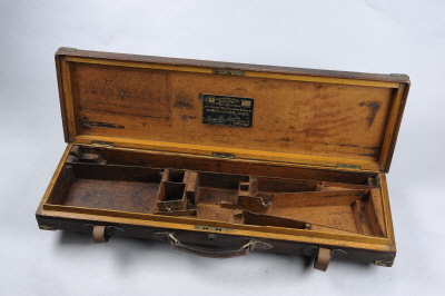 JAMES MACNAUGHTON A BRASSBOUND OAK AND LEATHER GUN CASE with compartment for 30-inch barrels, leather lined interior |