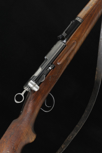 A SWISS 7.5X55 SCHMIDT RUBIN STRAIGHT PULL BOLT-ACTION SERVICE RIFLE, NO. 704601 25-inch barrel with raised fore sight and adjustable tangent rear sight, the receiver with the Swiss cross emblem, magazine missing, the full length stock with hand guard and steel furniture, 13-inch pull, 9lb., nitro proof S1 |