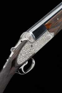 30-inch monobloc barrels with 2 3/4-inch chambers, about 1/4 and 1/2 choke borings, solid file-cut rib, Kersten bolt extension, the frames, locks and gold numbered top levers engraved with bold acanthus scrollwork against a stippled ground, selective single triggers, non automatic safety catches, 14-inch figured stock with straight hand, 7lb. 7oz., nitro proof, leather motor case