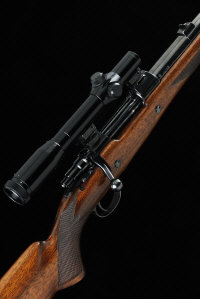 DOUMOULIN A BELGIAN .404 BOLT-ACTION SPORTING RIFLE, NO. B59282, MADE FOR PARKER HALE LTD 26 1/2-inch barrel with ramp fore sight and raised rear sight, the receiver mounted with a V-Nickel Marburg telescopic sight in claw mounts, side safety, recoil stud, the half length stock with pistol grip, cheekpiece and recoil pad, 15-inch pull including 1 1/2-inch extension, 9lb. 12oz., nitro proof |
