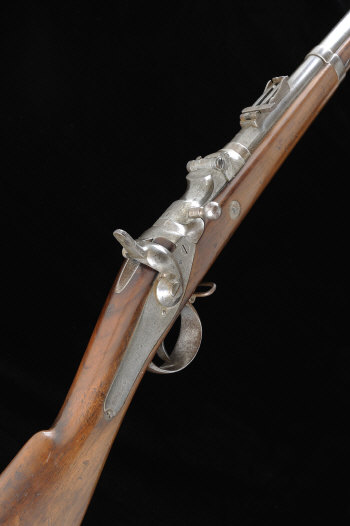 A BELGIAN ALBINI BRAENDLIN MODEL 1853/67 11MM SERVICE RIFLE, NO. 3967 34 1/2-inch barrel with folding ladder sight, the hinged breech with extractor, hammer with linked pin, the full length stock with steel furniture and cleaning rod, 13 3/4-inch pull, 10lb. 1oz. |