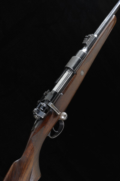 23 1/2-inch barrel with ramp fore sight with folding hood, the raised rear sight with folding leaf to 350, the receiver with matted top surface drilled for scope mounts, bolt with flag safety, recoil stud, the half length stock with pistol grip, cheekpiece and ribbed butt plate, 13 1/2-inch pull, sling eyes, 7lb., nitro proof, in its brassbound canvas case with maker's label