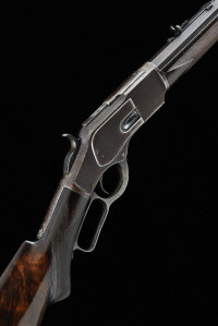 WINCHESTER A .44 WCF MODEL 1873 LEVER ACTION RIFLE, NO. 127987A 24-inch octagonal barrel with buck horn rearsight, full length magazine tube, the plain frame with engraved side panel, Thomas E. Keam, sliding top cover, 13-inch highly figured Deluxe grade stock with pistol grip and steel crescent butt plate, 8lb. 14oz., finish worn to a brown patination overall, left panel re-finished |