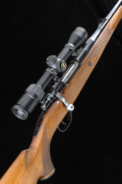 24-inch barrel with ramp fore sight and folding leaf sight, the receiver mounted with a Browning variable power telescopic sight, bolt with sliding tang safety, magazine with hinged base plate, recoil stud, the half length stock with pistol grip, cheekpiece and rubber recoil pad, 14 1/2-inch pull, 8lb. 2oz., nitro proof