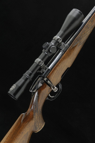 STEYR MANNLICHER A .243 MODEL L BOLT-ACTION SPORTING RIFLE, NO. 8487 21 1/2-inch replacement barrel, the receiver mounted with a Pecar Champion 6x45 telescopic sight in quick detachable mount, bolt with side safety, double set triggers, detachable box magazine, the half length stock with pistol grip, cheekpiece and maker's butt plate, 14 1/2-inch pull, 8lb. 4oz., nitro proof S1 |