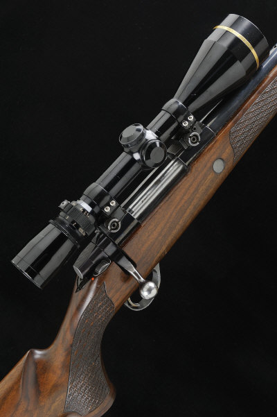 22-inch barrel with ramp fore sight, rear sight removed, the receiver mounted with a Leupold 3.5-10x50 telescopic sight, bolt with side safety, magazine with hinged fore plate, the half length stock with pistol grip, cheekpiece and rubber recoil pad, 8lb., nitro proof