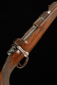 JOHN RIGBY & CO. A .350 MAGNUM BOLT ACTION SPORTING RIFLE, NO. 3859 24-inch barrel with raised foresight, rearsight with folding leaves to 400, square bridge Magnum Mauser action, bolt with side safety catch, possibly mismatched, magazine with hinged base plate, recoil stud, half length figured stock with pistol grip and rubber recoil pad, 14-inch pull, 7lb. 15oz., nitro proof |