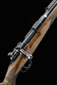 24-inch barrel with ramp fore sight, Express rear sight with folding leaves to 500, inlaid in gold with the retailer's name L de Rouvray, Ismalia, the receiver with matted top surface and impressed Mauser banner, bolt with flag safety, magazine with hinged base plate, the half length highly figured replacement stock with pistol grip, cheekpiece and recoil pad, 14 1/2-inch pull, 9lb., German nitro proof