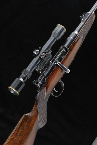 GEORGE GIBBS A .256 GIBBS MAGNUM BOLT-ACTION SPORTING RIFLE, NO. B7899 26-inch barrel with raised fore sight, rear sight with folding leaves to 500, the model 1906 Steyr receiver mounted with a B Nickel Marburg telescopic sight on quick detachable side mount, the half length stock with pistol grip, added raised cheekpiece and rubber recoil pad, sling eyes, 8lb. 10oz., nitro proof