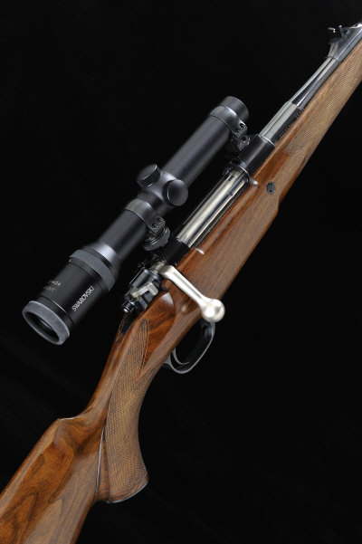 26-inch barrel with ramp fore sight, rear sight with fixed leaf, the double square bridge action mounted with a Swarovski 1.25-4x24 telescopic sight with quick detachable swing-off mounts, bolt with side safety, magazine with hinged base plate, the half length well figured stock with pistol grip, cheekpiece and rubber recoil pad, recoil stud, 14 1/2-inch pull, sling swivels, 9lb. 14oz., nitro proof
