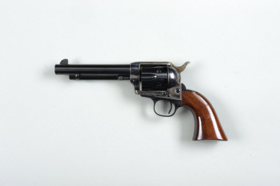 5 1/2-inch barrel with ejector rod, solid frame with loading gate, retaining most of its original hardening colour and finish, smooth walnut grip, Italian black powder proof, in its maker's carton with instructions, etc